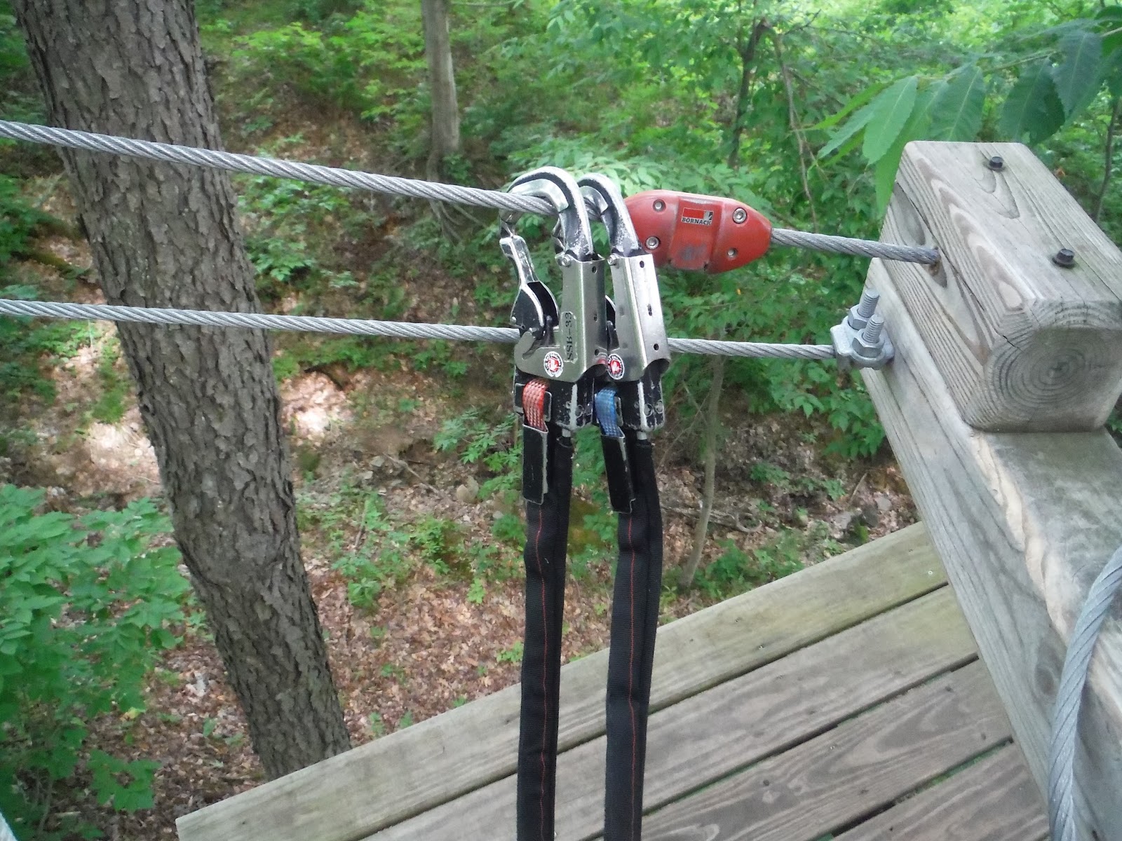 Here are the 2 locking lanyards. One was always locked so you could never not be connected to a line. Super safe, but it took a lot of work to move them between each line.